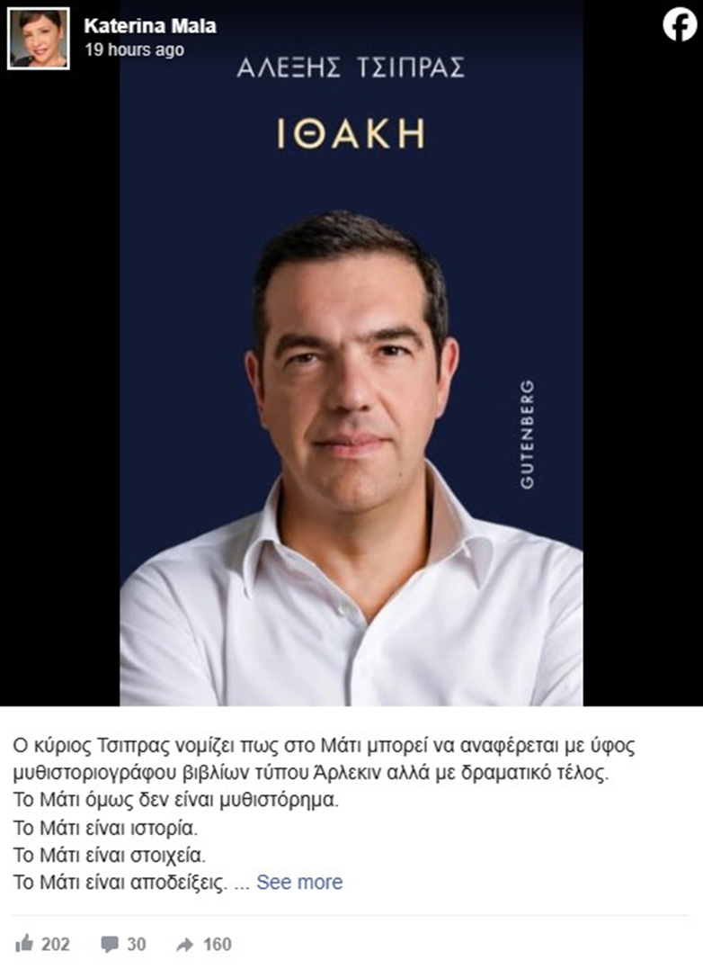 Η Κατερίνα Μαλά, επιζήσασα από την τραγωδία στο Μάτι, ασκεί κριτική στον πρώην Πρωθυπουργό, Αλέξη Τσίπρα, με αφορμή το επερχόμενο βιβλίο του, με τίτλο «Ιθάκη».