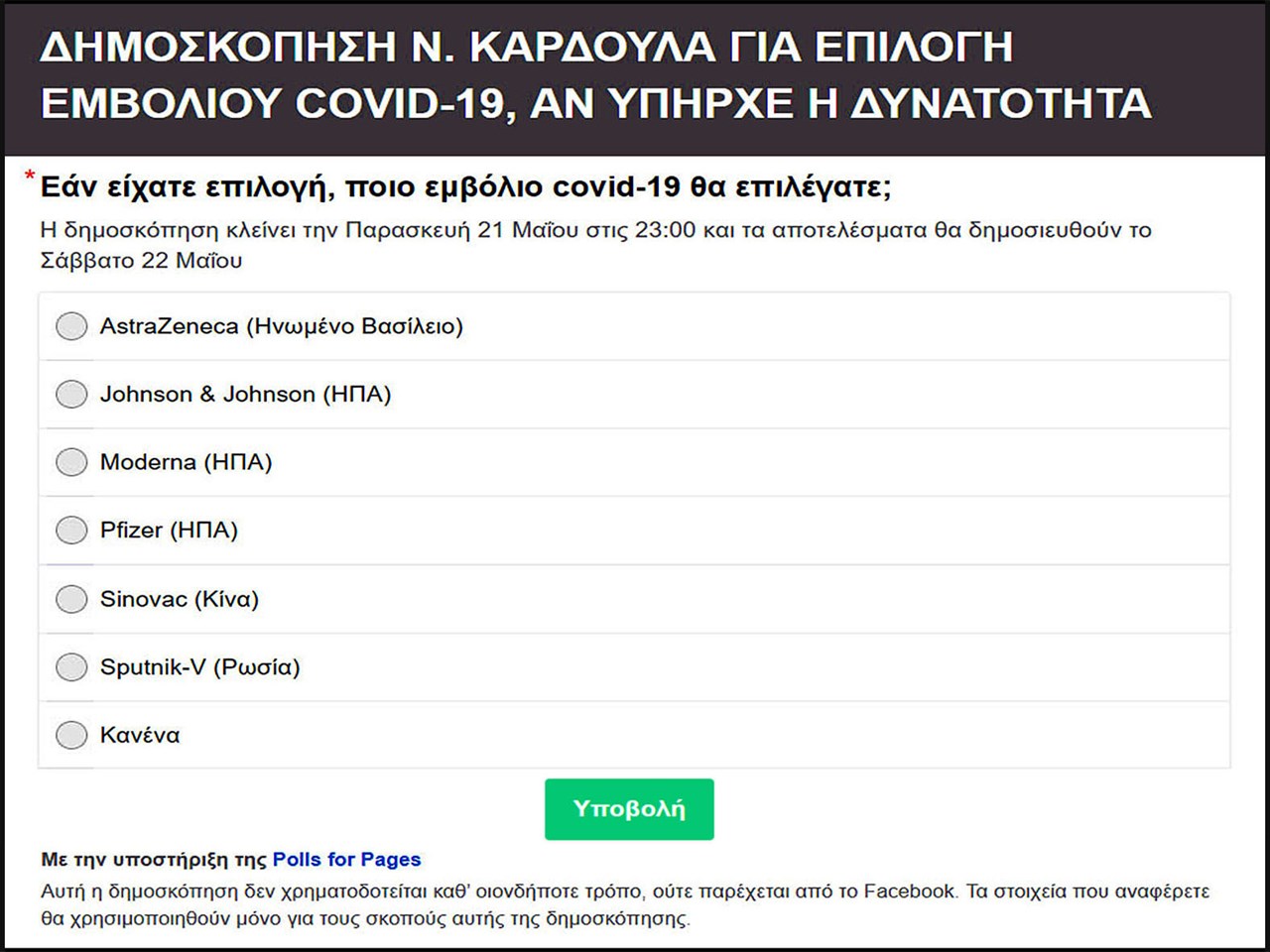 Τα αποτελέσματα της έρευνας κατόπιν των 1.054απαντήσεων στην ερώτηση «Εάν είχατε επιλογή, ποιο εμβόλιο covid-19 θα επιλέγατε;», φαίνονται παρακάτω: