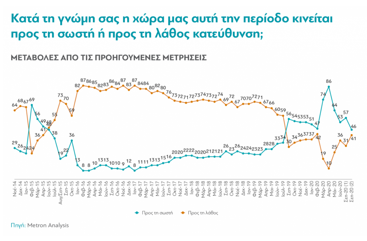 Έχει, πάντως, ενδιαφέρον να σημειώσουμε πως το ότι η άποψη “τα πράγματα πάνε προς τη σωστή κατεύθυνση” είναι πλειοψηφική είναι εξαιρετικά σπάνιο φαινόμενο. Μόνο σε 15 από τους τελευταίους 59 μήνες έχει εμφανιστεί, και μάλιστα οι 11 από αυτούς είναι οι 11 τελευταίοι -ένα πρωτοφανές σερί.