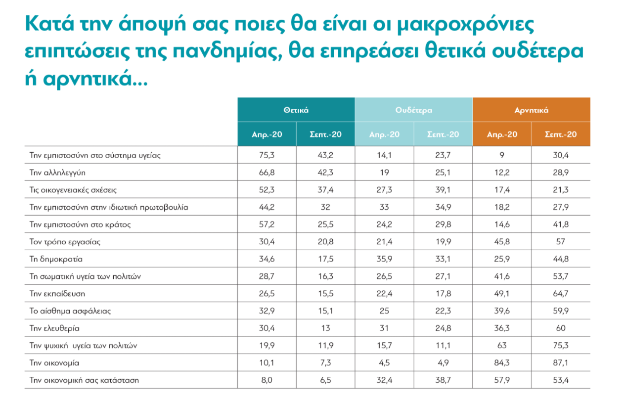 Η αλλαγή της στάσης των Ελλήνων ως προς τις διάφορες πτυχές της κρίσης γίνεται εμφανής και σε άλλες ερωτήσεις όπως, για παράδειγμα, στην ερώτηση περί μακροχρόνιων επιπτώσεων της πανδημίας. Τον Απρίλιο οι ερωτηθέντες εκτιμούσαν ότι οι θετικές συνέπειες στην εμπιστοσύνη στο σύστημα υγείας, την αλληλεγγύη της κοινωνίας, τις οικογενειακές σχέσεις αλλά και άλλους παράγοντες θα ήταν περισσότερες από τις αρνητικές. Τώρα οι εκτιμήσεις για θετικές επιπτώσεις σε όλους τους παράγοντες έχουν μειωθεί δραματικά, ενώ οι εκτιμήσεις για αρνητικές επιπτώσεις έχουν αυξηθεί πολύ.