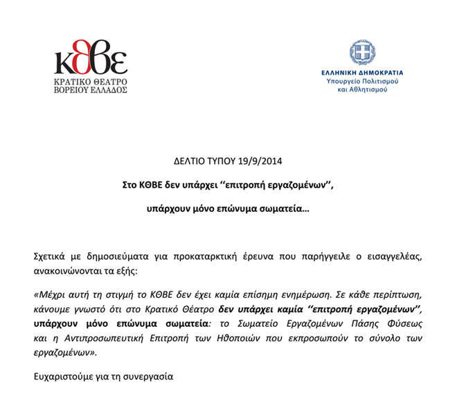 Την καταγγελία υπογράφει επιτροπή εργαζομένων του ΚΘΒΕ, που κάνουν λόγο για εικόνα διαφθοράς στο Θέατρο. Σύμφωνα με πληροφορίες, τοποθετούν στο «κάδρο» την πρόεδρο του ΚΘΒΕ Μένη Λυσσαρίδου και τον καλλιτεχνικό του διευθυντή Γιάννη Βούρο.