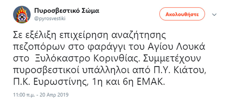 Στη επιχείρηση εντοπισμού των πεζοπόρων συμμετέχουν πυροσβεστικοί υπάλληλοι από Π.Υ. Κιάτου, Π.Κ. Ευρωστίνης, η 1η και 6η ΕΜΑΚ.