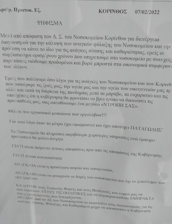 Μια ομάδα εργαζομένων στο Νοσοκομείο Κορίνθου, που αποτελείται από δεκάδες άτομα, καταγγέλλει την απόφαση του Δ.Σ. να διεξάγει διαγωνισμό για την κάλυψη των αναγκών φύλαξης του κτηρίου.