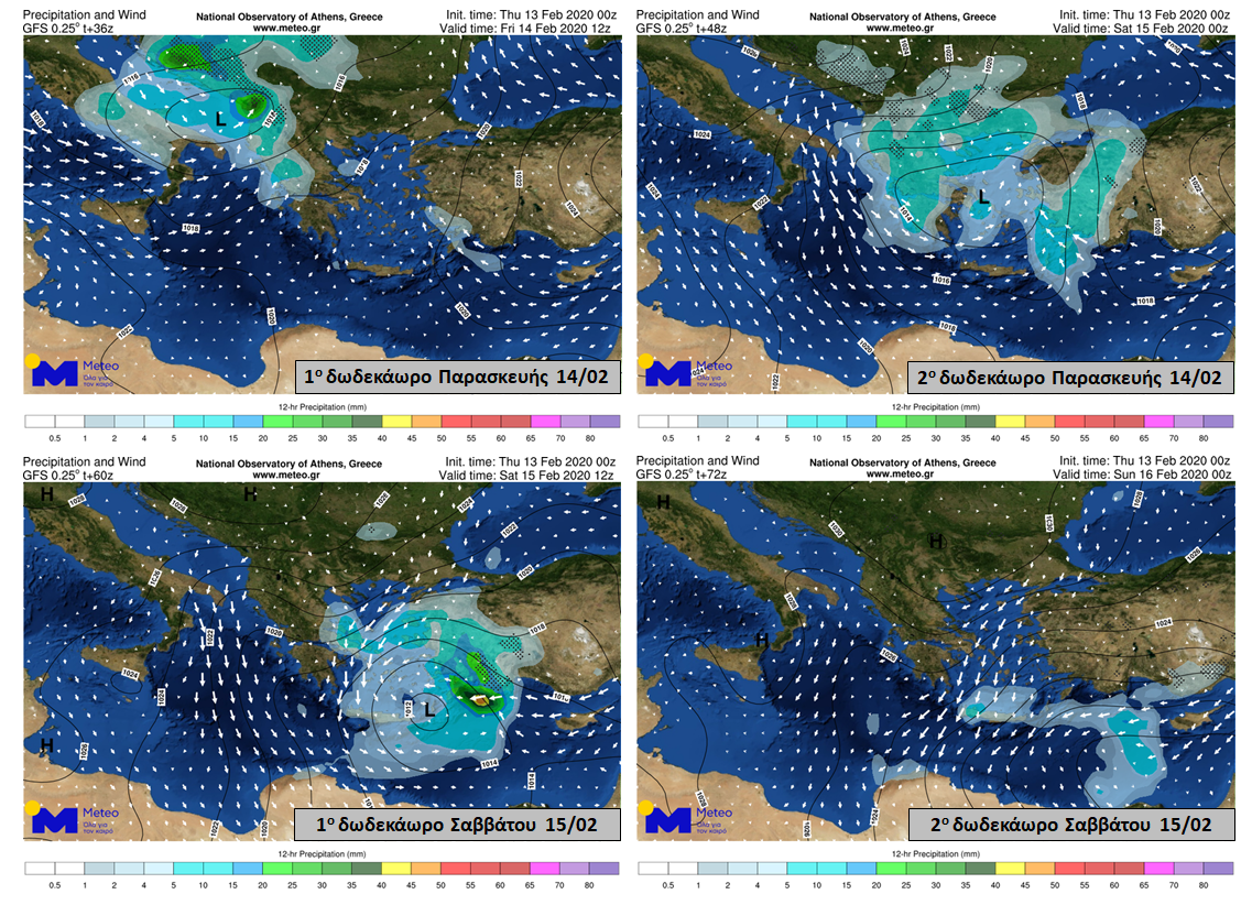 Στους χάρτες που ακολουθούν φαίνεται η κίνηση του χαμηλού, ο υετός και η ταχύτητα και διεύθυνση του ανέμου κατά το διήμερο Παρασκευή 14/2-Σάββατο 15/2.