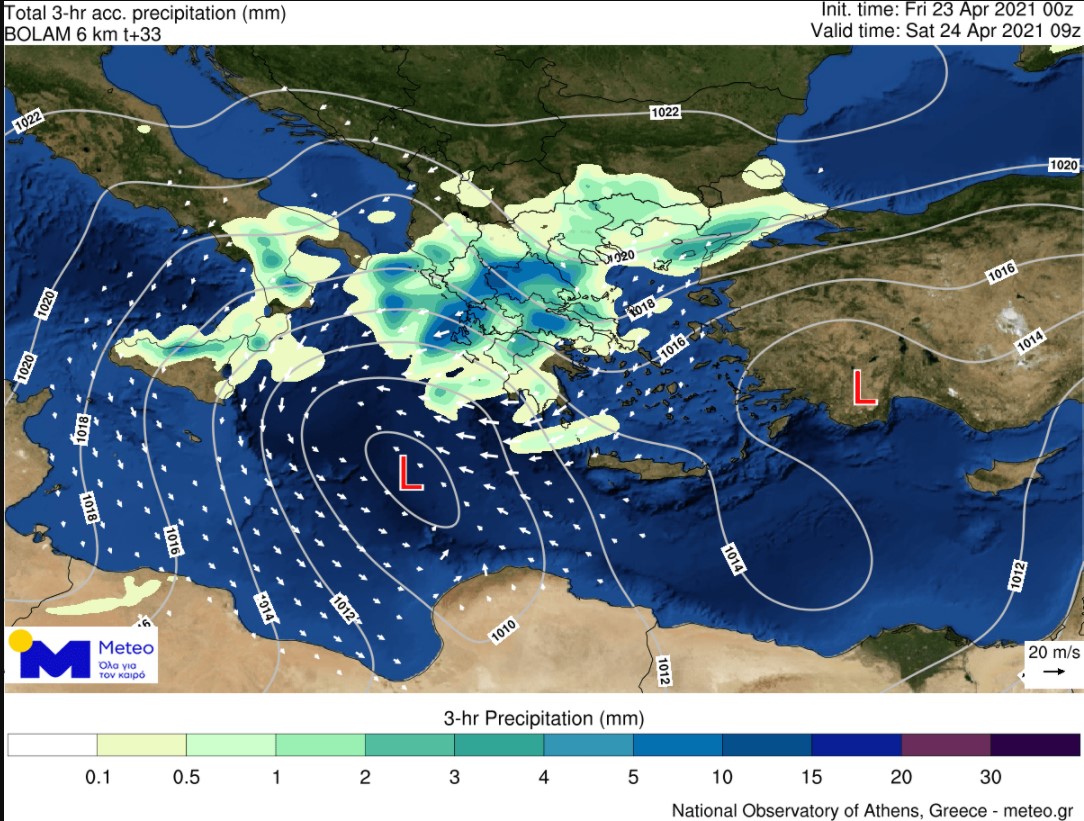 «Σύμφωνα με το Έκτακτο Δελτίο Επιδείνωσης Καιρού που εκδόθηκε σήμερα Παρασκευή 23 Απριλίου 2021 από την Εθνική Μετεωρολογική Υπηρεσία (ΕΜΥ), πρόσκαιρη επιδείνωση του καιρού προβλέπεται από το Σάββατο (24-04-2021) έως τις πρωινές ώρες της Κυριακής (25-04-2021), με ισχυρές βροχοπτώσεις κατά τόπους στην κεντρική και τη βόρεια χώρα.