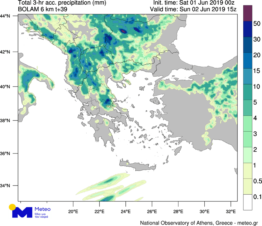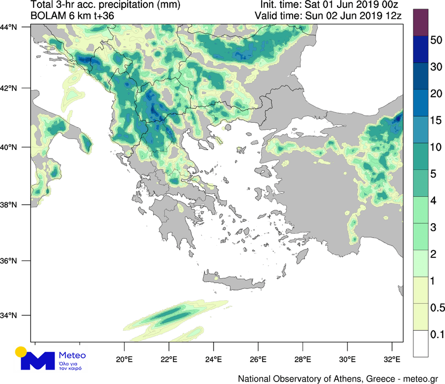Τα φαινόμενα θα είναι κατά τόπους ισχυρά και θα συνοδεύονται σε κάποιες περιπτώσεις από χαλαζοπτώσεις. Μεγαλύτερη πιθανότητα για εκδήλωση χαλαζοπτώσεων υπάρχει στη Μακεδονία, τη Θράκη, την Ανατολική Θεσσαλία και δευτερευόντως στο Βόρειο Αιγαίο. Στους χάρτες που ακολουθούν μπορείτε να δείτε τις περιοχές που αναμένονται βροχοπτώσεις το μεσημέρι και νωρίς το απόγευμα της Κυριακής 02/06.