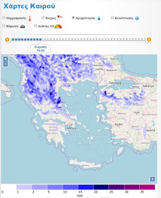 Σύμφωνα με την ΕΜΥ, προβλέπονται βροχές και καταιγίδες, οι οποίες θα είναι τοπικά ισχυρές και πιθανώς να συνοδεύονται από χαλαζοπτώσεις, στις εξής περιοχές για την Κυριακή: