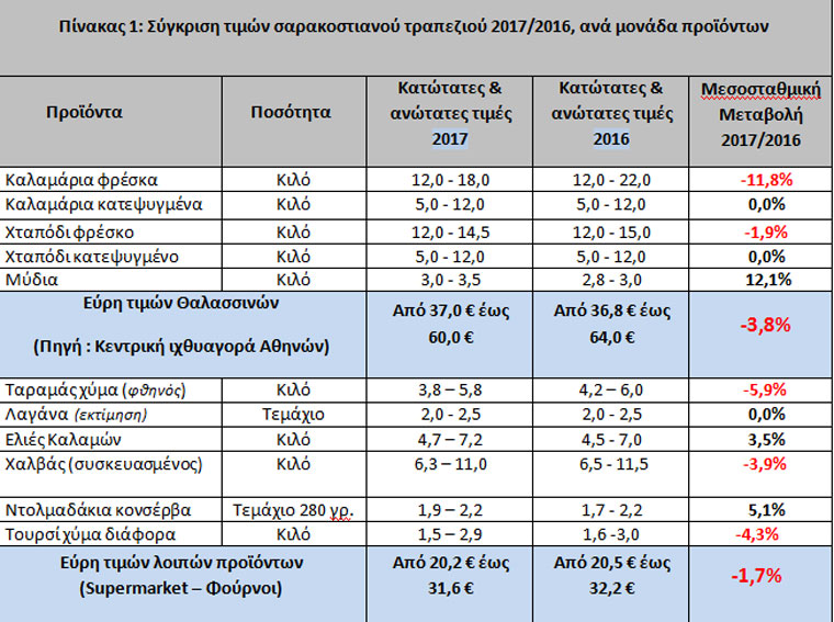 Όσον αφορά στα λοιπά προϊόντα που πλαισιώνουν το σαρακοστιανό τραπέζι, όπως η λαγάνα, οι ελιές, ο ταραμάς, το τουρσί, ο χαλβάς αλλά και τα κονσερβοποιημένα προϊόντα, καταγράφονται μεικτές τάσεις σε σχέση με πέρυσι, με αποτέλεσμα το εύρος τιμών μεταξύ 2017 και 2016 να βαίνει μειούμενο κατά 1,7%. Βάσει των παραπάνω διαπιστώσεων, το φετινό μέσο κόστος του σαρακοστιανού τραπεζιού που περιλαμβάνει φρέσκα θαλασσινά & οστρακοειδή κυμαίνεται μεταξύ 47,2 – 67,6 € έναντι 47,3 – 72,2 € του αντίστοιχου περσινού, καταγράφοντας μία μεσοσταθμική υποχώρηση 3,9%. Συμπεριλαμβανομένων μόνο των κατεψυγμένων θαλασσινών και οστρακοειδών τα παραπάνω εύρη τιμών αναπροσαρμόζονται στα 33,2 – 59,1 € το 2017 και στα 33,3 – 59,2 € το 2016, με αποτέλεσμα να προκύπτει μία αμελητέα πτωτική μεταβολή της τάξεως του -0,2%.».