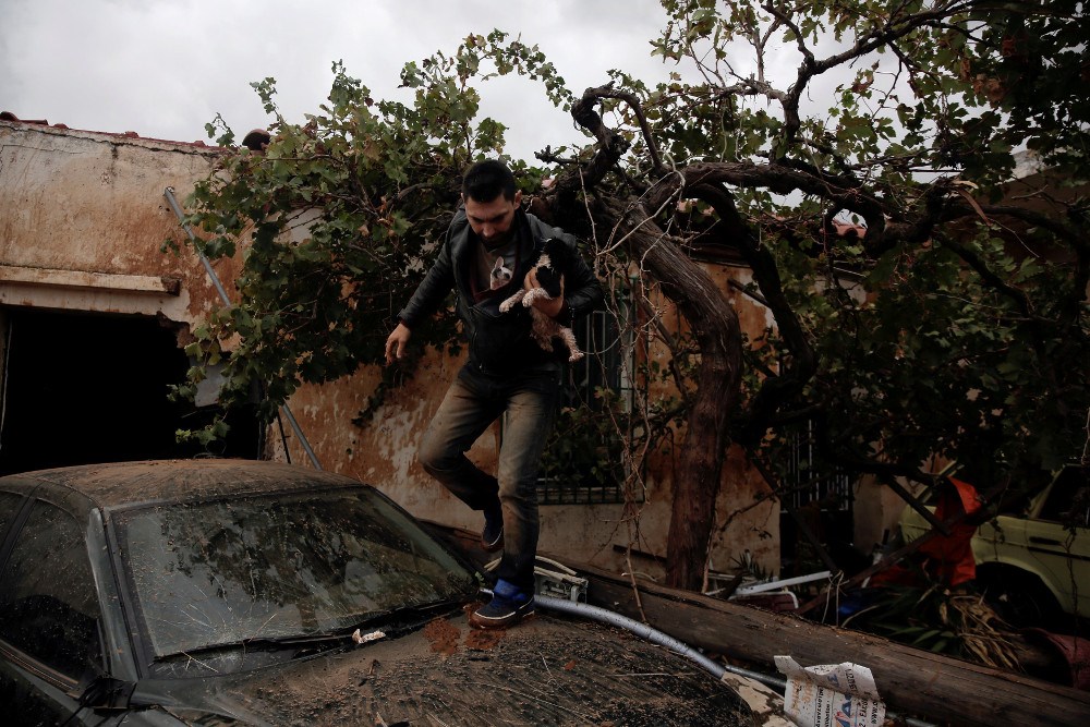 Τον γύρο του διαδικτύου κάνουν οι φωτογραφίες ενός άνδρα που σώζει ένα γατάκι και ένα σκυλάκι από τις πληγείσες περιοχές της Δυτικής Αττικής.