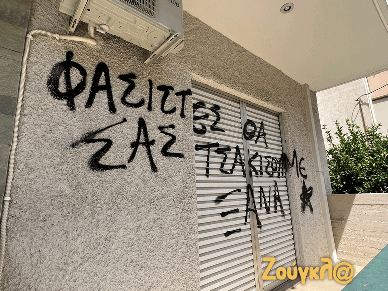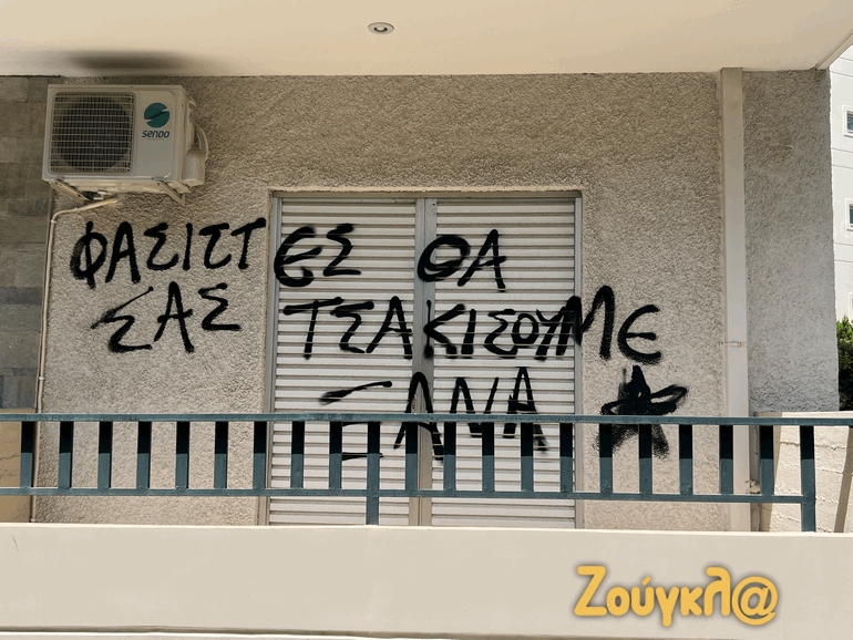 Συγκεκριμένα, άγνωστοι, στις 03:10 τα ξημερώματα, έσπασαν τη τζαμαρία στο ισόγειο που βρίσκονται τα γραφεία και έγραψαν συνθήματα.