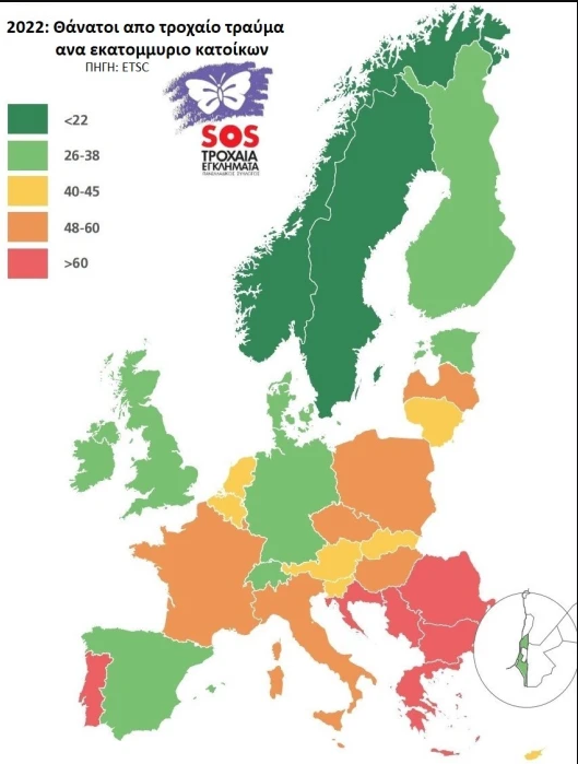 Από 624 νεκρούς στους ελληνικούς δρόμους το 2021 ανεβήκαμε στους 635 το 2022 (προσωρινά στοιχεία που αναμένεται να αυξηθούν). Ο αριθμός αυτός σημαίνει 61 νεκρούς ανα εκατομμύριο κατοίκων στη χώρα μας τη στιγμή που στις άλλες χώρες έχουμε: 21 στη Νορβηγία, 22 στην Σουηδία, 26 στη Δανία και στο Ηνωμένο Βασίλειο, 28 στην Ελβετία, 31 στην Ιρλανδία, 33 στη Γερμανία κλπ. Σε σχέση δηλαδή με τις παραπάνω χώρες ο χρήστης του ελληνικού οδικού δικτύου έχει διπλάσια ή και τριπλάσια πιθανότητα θανάτου!.