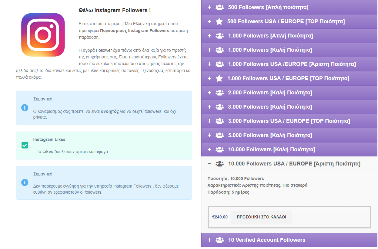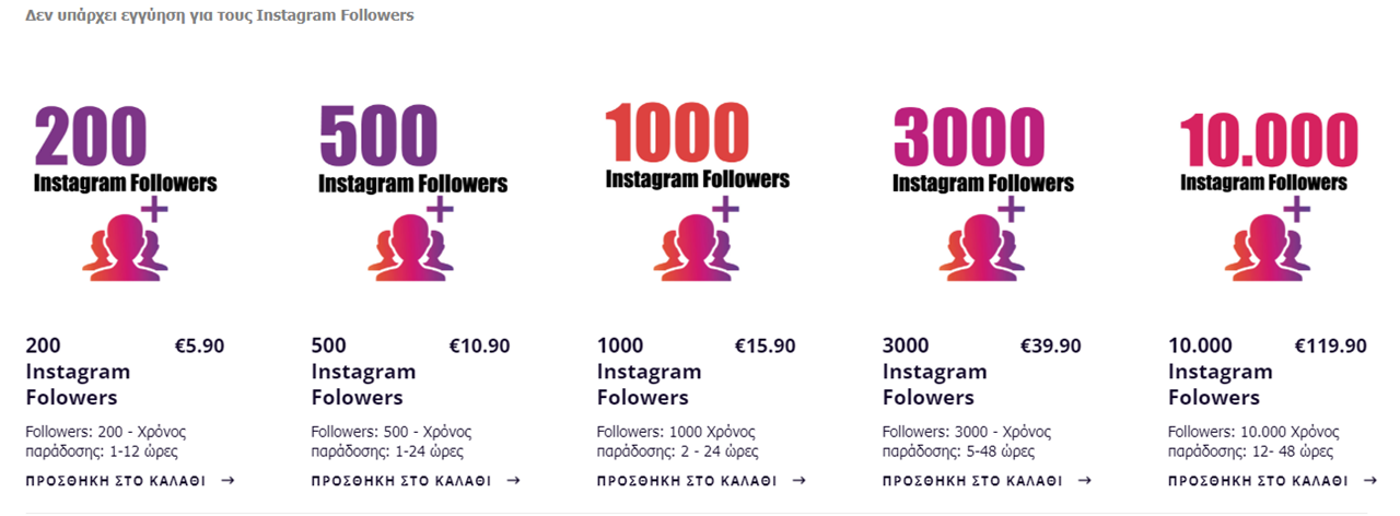 Υπάρχουν και φθηνότερες επιλογές, καθώς δεν υπάρχει δυνατότητα να διαπιστώσει ο αγοραστής αν οι ψεύτικοι followers του θα είναι από τους εξαιρετικής ποιότητας Ευρωπαίους και Αμερικάνους ή από τους δεύτερης κατηγορίας Ασιάτες και Αφρικάνους. Στη σελίδα buyfollowers.gr οι 10.000 ακόλουθοι στο Instagram κοστίζουν 119,9 ευρώ, δηλαδή λιγότερο από τα μισά από το προηγούμενο παράδειγμα, αλλά ο πωλητής το λέει ξεκάθαρα: Δεν υπάρχει εγγύηση γι’ αυτό που αγοράζεις.