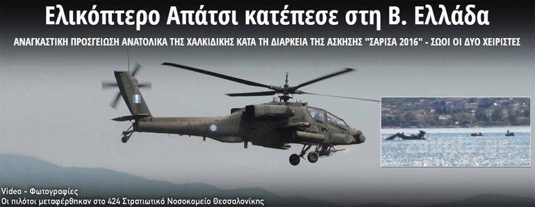 Ενημερώνουμε ότι την Τρίτη 20 Σεπτεμβρίου 2016 και περί ώρα 09:00, κατά τη διάρκεια δραστηριοτήτων της Άσκησης «ΣΑΡΙΣΑ – 2016», ελικόπτερο ΑΗ-64D της Αεροπορίας Στρατού κατέπεσε στη θαλάσσια περιοχή του Κόλπου Ορφανού.