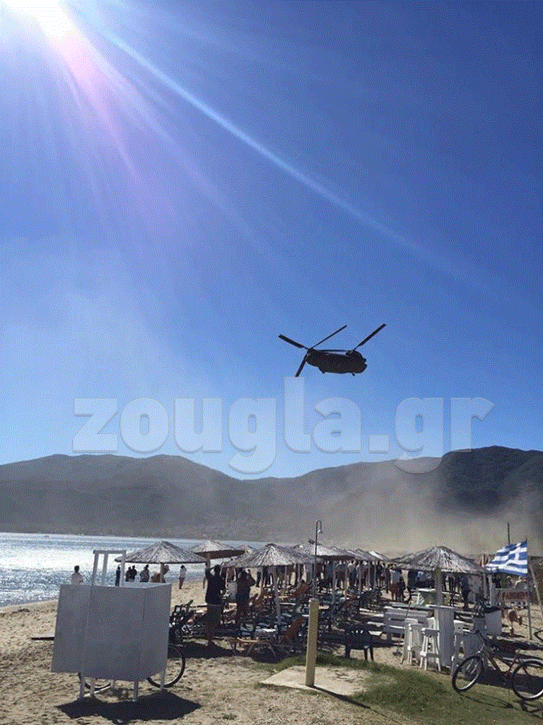 Δείτε φωτογραφίες με ελικόπτερα, τύπου Chinook, να πετούν πάνω από παραλία με λουόμενους, πολύ κοντά σε σπίτια και στύλους της ΔΕΗ…