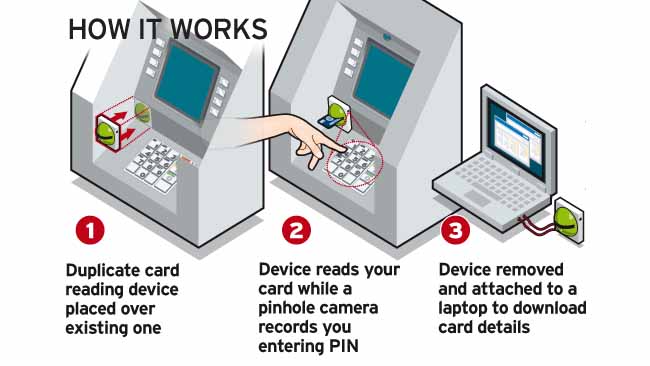 • Στην περίπτωση αυτή, οι δράστες τοποθετούν στο ΑΤΜ ηλεκτρονική ιδιοκατασκευή, η οποία μπορεί να υποκλέπτει τα προσωπικά δεδομένα που περιέχονται στις κάρτες πληρωμής των τραπεζών (δεδομένα της μαγνητικής πίστας της κάρτας, μυστικός αριθμός PIN).