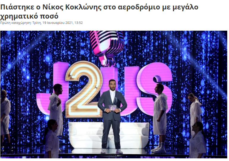 Μόλις είχε προσγειωθεί στο Ελευθέριος Βενιζέλος το αεροσκάφος που εκτελούσε την πτήση από το Ντουμπάι. Ο τηλεοπτικός παρουσιαστής Νίκος Κοκλώνης, παρέα με τον φίλο του τον Βασίλη, εξήλθε του αεροσκάφους και κατευθύνθηκε προς τον έλεγχο διαβατηρίων και βεβαίως στη συνέχεια προς τον έλεγχο των τελωνειακών, διότι πρόκειται για ταξιδιώτες που έφτασαν στην Ελλάδα από χώρα μη μέλος της Ευρωπαϊκής Ένωσης και βεβαίως εκτός περιβάλλοντος Σένγκεν.