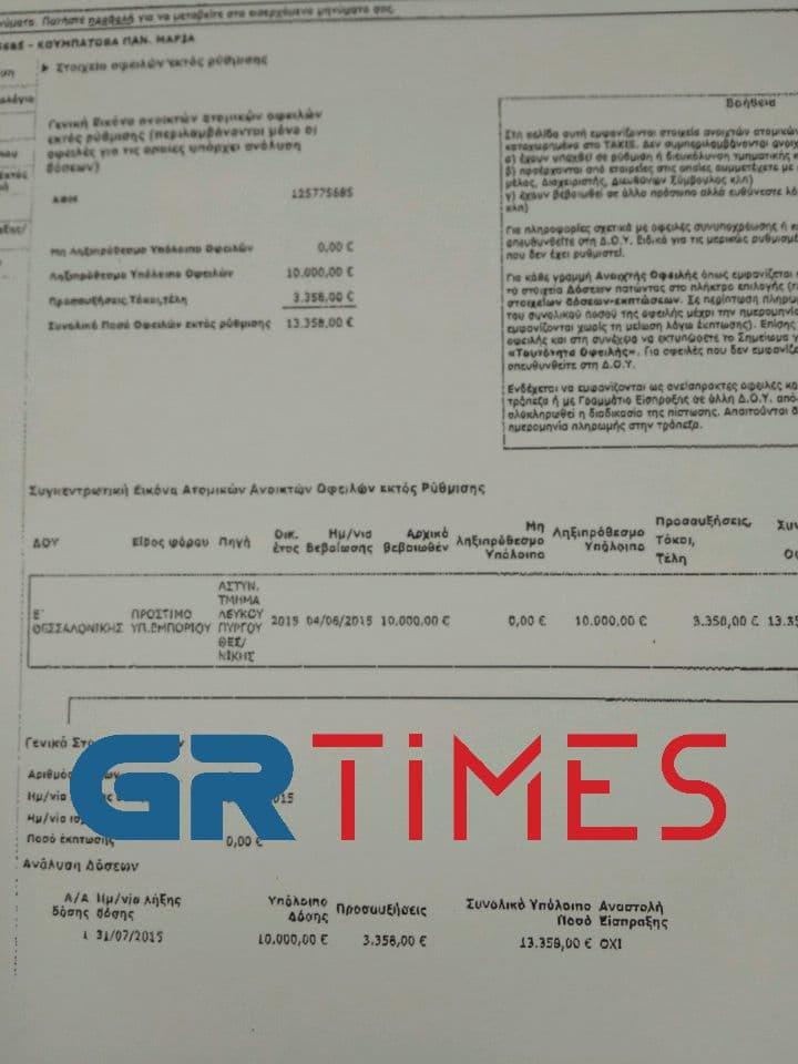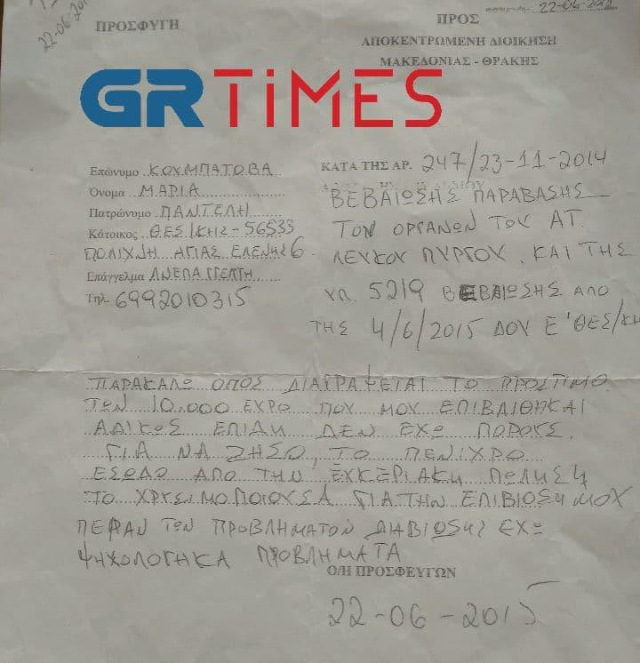 Μέσω του GRTimes.gr η 82χρονη σήμερα Μαρία Κουμπάτοβα, ομογενής από την Ρωσία απευθύνει έκκληση στις αρμόδιες Αρχές να της «σβήσουν» το πρόστιμο των 10.000 ευρώ που της επιβλήθηκε πριν από πέντε χρόνια όταν συνελήφθη από αστυνομικούς στην πλατεία Αριστοτέλους να πουλά τερλίκια. Έκπληκτη η κόρη της κ. Μαρίας, Τάμαρα Σαρίδου διαπίστωσε πριν λίγες ημέρες όταν θέλησε να υποβάλει την φορολογική δήλωση της μητέρας της πως στα 10.000 ευρώ προστέθηκαν άλλα 3.358 ευρώ τόκοι. Το χρέος που καλείται να πληρώσει η 82χρονη γιαγιά είναι θηλιά στο λαιμό, αφού όπως ισχυρίζεται ξυπνά και κοιμάται με αυτό το άγχος.