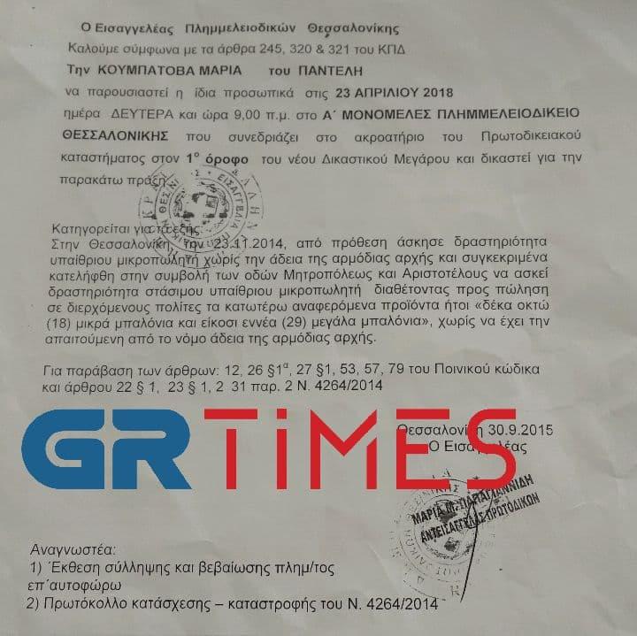 Όλα συνέβησαν το 2014 όταν η 78χρονη τότε κ. Μαρία, χωρίς κανένα εισόδημα και με ανάγκη να αγοράζει φάρμακα αποφάσισε για να μπορέσει να εξασφαλίσει τα προς το ζην να πάρει τα τερλίκια που έπλεξε και να τα πουλήσει στην πλατεία Αριστοτέλους. Πριν καλά καλά «στήσει» το εμπόρευμα της σε αυτοσχέδιο πάγκο την συνέλαβαν.