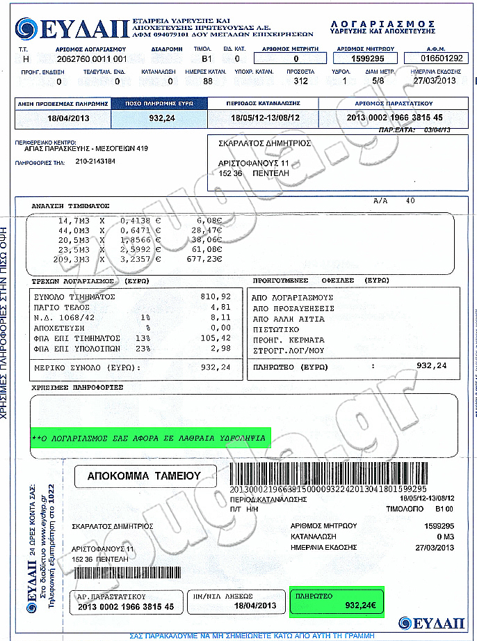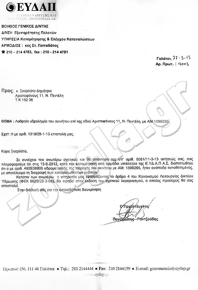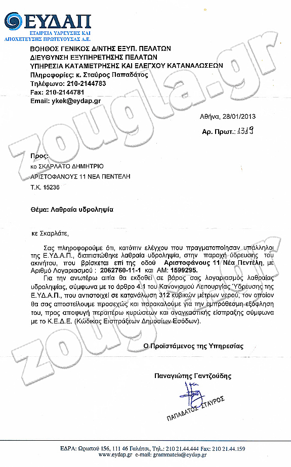 Σ.Σ. Το zougla.gr επικοινώνησε με την ΕΥΔΑΠ, ο αρμόδιος όμως ο οποίος και «χειρίστηκε» το συγκεκριμένο θέμα αρνήθηκε να δώσει οποιαδήποτε διευκρίνιση, επικαλούμενος «ζήτημα προσωπικών δεδομένων του πελάτη»(!)