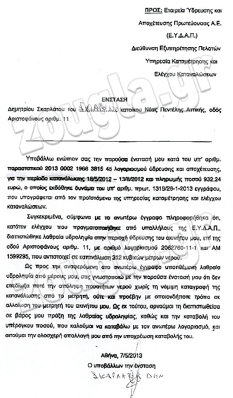 Όπως ήταν επόμενο, ο Δημήτρης Σκαρλάτος επισκέφθηκε αμέσως το αρμόδιο υποκατάστημα της ΕΥΔΑΠ στην Αγία Παρασκευή, όπου και διαμαρτυρήθηκε για όσα απίστευτα του καταμαρτυρούσαν, αφού ποτέ του δεν είχε καν διανοηθεί να κάνει κάτι τέτοιο, ούτε και είχε ανάγκη να κάνει, αφού ο συγκεκριμένος πελάτης της ΕΥΔΑΠ είχε την τύχη να διαθέτει μέσα στο κτήμα του πηγάδι από το οποίο μπορεί να προμηθεύεται όσο νερό θέλει ! (όπως και κάνει).