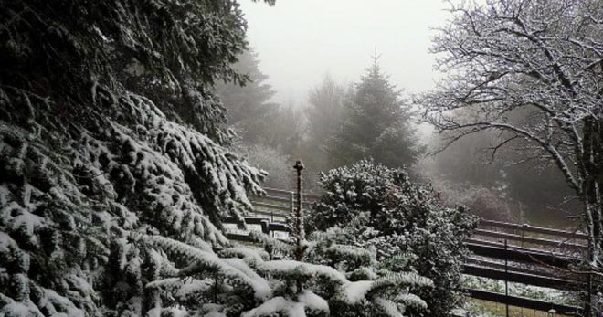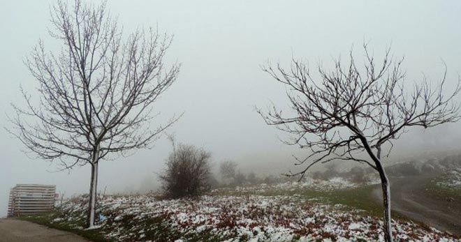 Οι φωτογραφίες που δημοσιεύει το eviagreen.gr είναι από τη Σέτα, όπου η θερμοκρασία βρίσκεται υπό το μηδέν. Σε συνδυασμό με την ομίχλη, το τοπίο είναι μαγικό. Το χιόνι έχει σκεπάσει ελαφρώς τα σπίτια και τα δέντρα.
