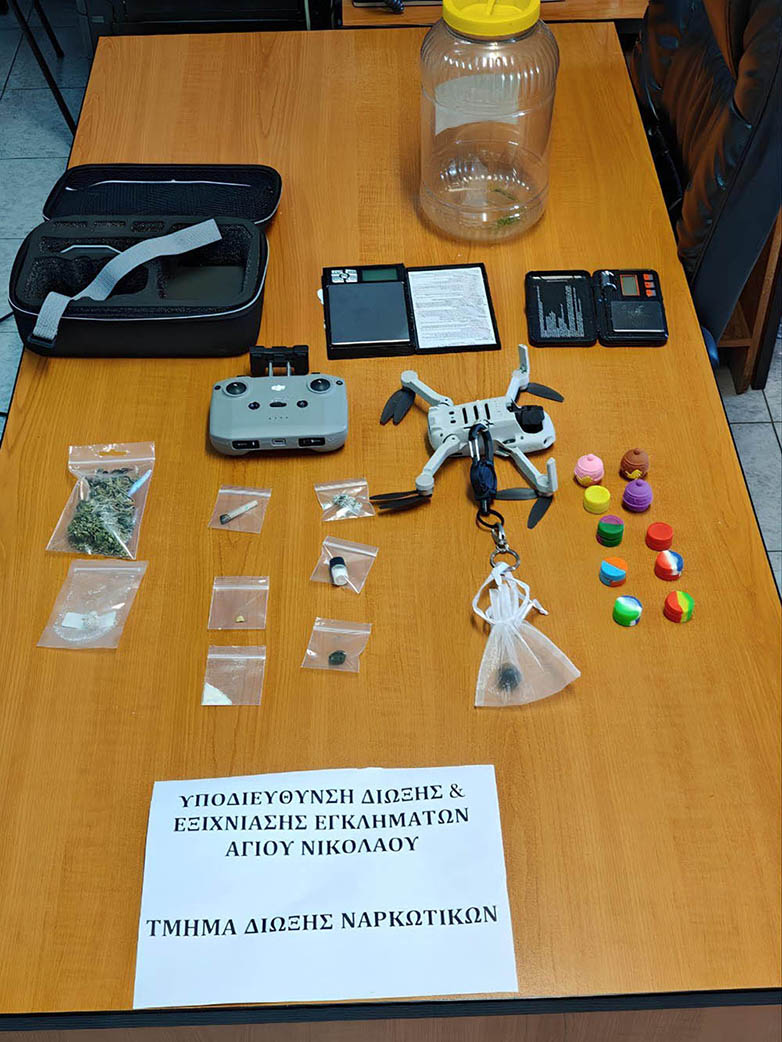 Συνολικά οι αρχές βρήκαν και κατάσχεσαν: 15,1 γραμμάρια χασίς, μικροποσότητα κάνναβης σε μορφή σοκολάτας, χάπια έκστασι, τσιγαριλίκι, μικροποσότητα ελαίου κάνναβης, δύο ζυγαριές ακριβείας, το drone, 10 λαστιχένια κουτιά με υπολείμματα ακατέργαστης κάνναβης και ένα βάζο με υπολείμματα χασίς.