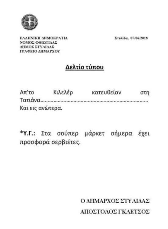 Από την πλευρά του ο Απόστολος Γκλέτσος έδωσε τη δική του απάντηση στην καταγγελία με ένα ειρωνικό δελτίο Τύπου στο οποίο αναφέρει: «Από το Κιλελέρ κατευθείαν στην Τατιάνα…. και εις ανώτερα. YΓ: Στα σούπερ μάρκετ σήμερα έχει προσφορά σερβιέτες».