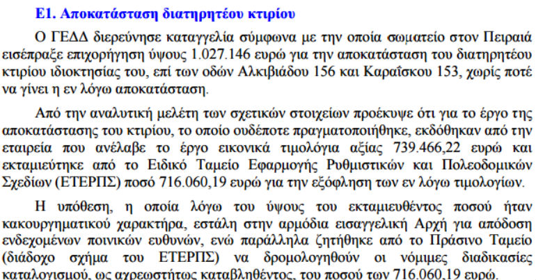 Χαρακτηριστική είναι η περίπτωση σωματείου στον Πειραιά, το οποίο εισέπραξε επιχορήγηση ύψους 1.027.146 ευρώ, για την αποκατάσταση διατηρητέου ιδιόκτητου κτηρίου, χωρίς ποτέ να πραγματοποιηθεί η παραμικρή εργασία.