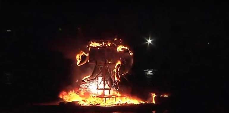 Στη συνέχεια ο δήμαρχος, αφού κήρυξε την λήξη του καρναβαλιού του 2017, ευχήθηκε καλή αρχή για το καρναβάλι του 2018, με την πίστη, όπως πρόσθεσε, ότι «ο χώρος που βρισκόμαστε θα ανήκει του χρόνου στον πατραϊκό λαό και θα έχει ξεκινήσει η ανάπλαση.» Αμέσως μετά, ο καρνάβαλος παραδόθηκε στις φλόγες, ενώ ο ουρανός της πόλης φωτίστηκε από χιλιάδες πυροτεχνήματα. Μάλιστα, ήταν τόσο εντυπωσιακά, όπου στο τέλος, ο κόσμος που βρισκόταν συγκεντρωμένος στην παραλιακή ζώνη ξέσπασε σε χειροκροτήματα.