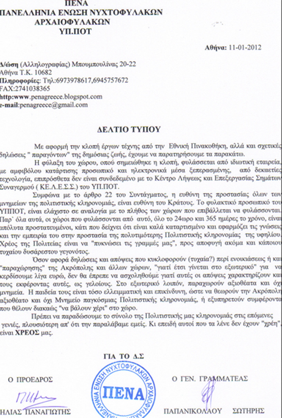 Τη δική της απάντηση έδωσε η Π.Ε.Ν.Α. (Πανελλήνια Ένωση Νυχτοφυλάκων Αρχαιοφυλάκων), σε ό,τι αφορά στην κλοπή έργων τέχνης από την Εθνική Πινακοθήκη.