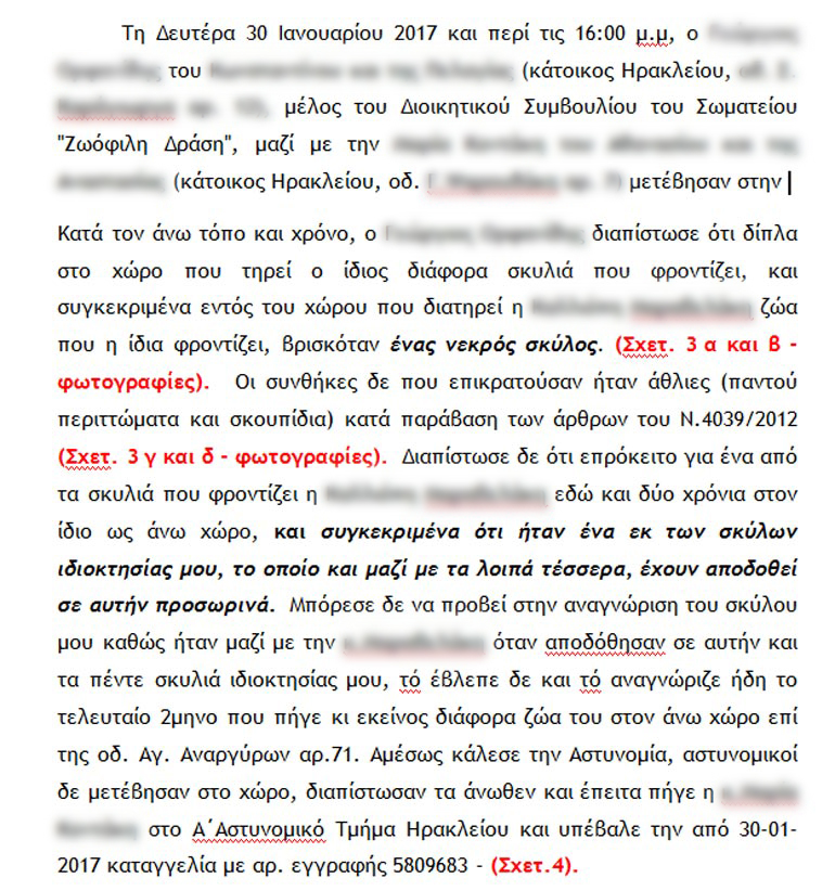 ΠΗΓΑΝ ΛΟΙΠΟΝ ΤΕΣΣΕΡΑ ΑΤΟΜΑ ΕΚΕΙ, ΔΥΟ ΑΝΔΡΕΣ ΚΑΙ ΔΥΟ ΓΥΝΑΙΚΕΣ (ΑΚΟΥΓΟΝΤΑΙ ΣΤΟ ΒΙΝΤΕΑΚΙ ΝΑ ΜΙΛΑΝΕ), ΠΗΡΑΝ ΒΙΝΤΕΑΚΙ ΚΑΙ ΦΩΤΟΓΡΑΦΙΕΣ, ΑΥΤΟ ΤΟΥΣ ΕΝΔΙΕΦΕΡΕ ΑΛΛΩΣΤΕ, ΚΑΙ ΟΧΙ ΚΑΤΙ ΑΛΛΟ ΓΙΑ ΑΥΤΟ ΠΑΡΑΤΗΣΑΝ ΤΟ ΚΟΥΦΑΡΙ ΤΟΥ ΑΤΥΧΟΥ ΣΚΥΛΙΟΥ ΓΙΑ ΝΑ ΤΟ ΤΡΩΝΕ ΤΑ ΑΛΛΑ 7 ΣΚΥΛΙΑ. ΜΕΤΑ ΕΓΚΑΤΕΛΕΙΨΑΝ ΤΟ ΧΩΡΟ ΚΑΙ ΠΕΡΙΠΟΥ ΣΤΙΣ 13:00 ΚΑΛΕΣΑΝ ΤΟ 100 ΚΑΙ ΕΚΑΝΑΝ ΑΝΩΝΥΜΗ ΚΑΤΑΓΓΕΛΙΑ. Η ΑΣΤΥΝΟΜΙΑ ΠΗΓΕ ΚΑΙ ΕΚΑΝΕ ΤΗΝ ΔΟΥΛΕΙΑ ΤΗΣ, ΜΑΛΙΣΤΑ ΤΗΝ ΒΡΗΚΑ ΕΚΕΙ ΚΑΤΑ ΤΥΧΗ ΟΤΑΝ ΠΗΓΑ ΜΕΤΑ ΤΗΝ ΔΟΥΛΕΙΑ ΜΟΥ ΓΙΑ ΝΑ ΤΑΪΣΩ ΚΑΙ ΚΑΘΑΡΙΣΩ ΤΑ ΖΩΑ. ΜΟΥ ΕΙΠΑΝ ΠΩΣ ΕΙΧΑΝ ΑΝΩΝΥΜΗ ΚΑΤΑΓΓΕΛΙΑ, ΜΟΥ ΕΔΕΙΞΑΝ ΤΟ ΣΚΟΤΩΜΕΝΟ ΚΑΙ ΦΑΓΩΜΕΝΟ ΣΚΥΛΑΚΙ ΣΤΗΝ ΠΕΡΙΦΡΑΞΗ, ΤΟΥΣ ΕΞΗΓΗΣΑ ΤΙ ΕΙΧΕ ΠΙΘΑΝΩΣ ΣΥΜΒΕΙ, ΒΓΑΛΑΜΕ ΕΞΩ ΤΟ ΑΤΥΧΟ ΖΩΑΚΙ, ΦΡΟΝΤΙΣΑ ΓΙΑ ΤΗΝ ΤΑΦΗ ΤΟΥ ΚΑΙ ΣΤΗΝ ΣΥΝΕΧΕΙΑ ΤΑΚΤΟΠΟΙΗΣΑ ΤΑ ΣΚΥΛΙΑ ΣΤΙΣ ΔΥΟ ΠΕΡΙΦΡΑΞΕΙΣ. ΑΦΟΥ ΟΙ ΑΣΤΥΝΟΜΙΚΟΙ ΕΙΔΑΝ ΟΤΙ ΤΑ ΣΚΥΛΙΑ ΤΩΝ ΠΕΝΤΕ ΠΕΡΙΦΡΑΞΕΩΝ ΗΤΑΝ ΓΕΡΑ ΚΑΙ ΔΥΝΑΤΑ, ΑΠΟΧΩΡΗΣΑΝ ΓΙΑ ΝΑ ΠΑΝΕ ΣΤΗΝ ΔΟΥΛΕΙΑ ΤΟΥΣ. ΠΡΟΦΑΝΩΣ ΟΜΩΣ ΚΑΠΟΙΟΣ ΠΑΡΑΚΟΛΟΥΘΟΥΣΕ ΤΙ ΣΥΝΕΒΑΙΝΕ ΣΤΟ ΧΩΡΟ ΤΟΥ ΟΙΚΟΠΕΔΟΥ ΚΑΙ ΑΦΟΥ ΕΙΔΕ ΑΝΙΚΑΝΟΠΟΙΗΤΟΣ ΟΤΙ ΔΕΝ ΜΕ ΣΥΝΕΛΑΒΑΝ , ΕΙΔΟΠΟΙΗΣΕ ΤΟΥΣ ΑΝΩΝΥΜΟΥΣ ΚΑΤΑΓΓΕΛΤΕΣ ΝΑ ΚΑΝΟΥΝ ΕΠΩΝΥΜΗ ΚΑΤΑΓΓΕΛΙΑ ΜΗΠΩΣ ΚΑΙ ΚΑΤΑΦΕΡΟΥΝ Η ΑΣΤΥΝΟΜΙΑ ΝΑ ΜΕ ΣΥΛΛΑΒΕΙ ΤΕΛΙΚΑ.