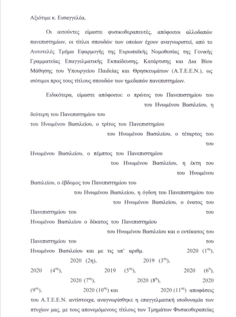 Στον εισαγγελέα απευθύνθηκαν Πτυχιούχοι Φυσικοθεραπευτές από Ανώτατα Ιδρύματα της μεγάλης Βρετανίας με σπουδές σε Ελληνικά Κολλέγια.