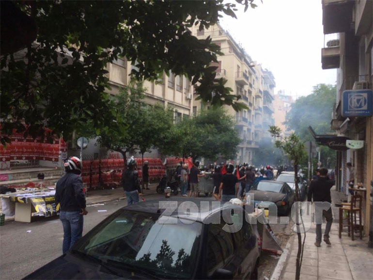 Σύμφωνα με πληροφορίες, νεαροί με φωτοβολίδες και τσεκούρια επιτέθηκαν σε φοιτητές που βρίσκονταν στο σημείο για τις φοιτητικές εκλογές και ακολούθησε συμπλοκή. Λίγο μετά υπήρξε επέμβαση μιας διμοιρίας των ΜΑΤ που απώθησε τους ταραξίες προς τα Εξάρχεια.