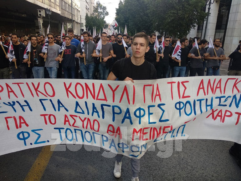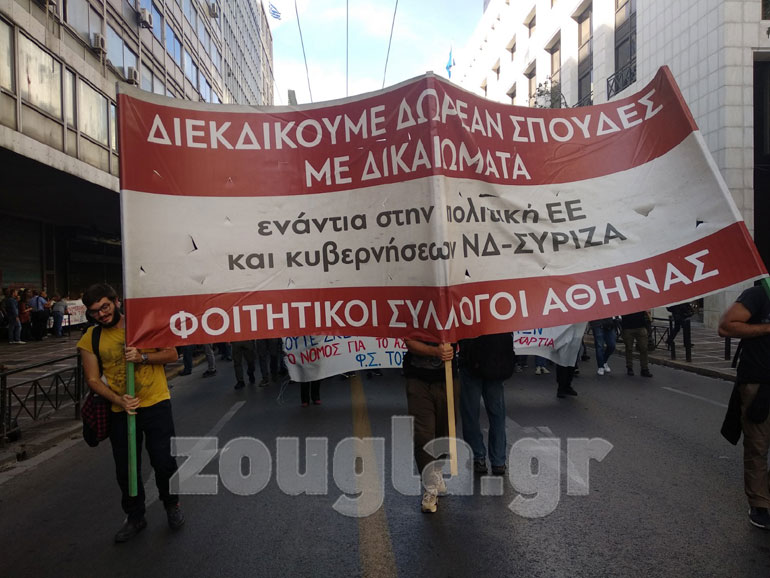 Με κεντρικό σύνθημα «διεκδικούμε δωρεάν σπουδές με δικαιώματα, ενάντια στην πολιτική ΕΕ και κυβερνήσεων ΝΔ-ΣΥΡΙΖΑ», οι διαδηλωτές συγκεντρώθηκαν στα Προπύλαια και στη συνέχεια κατευθύνθηκαν προς το Σύνταγμα.