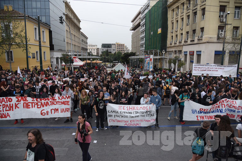 Νωρίτερα, στις 12.00 , αντιπολεμικό συλλαλητήριο πραγματοποίησαν στα Προπύλαια φοιτητικοί – σπουδαστικοί σύλλογοι, μαθητές αλλά και συλλογικότητες του αριστερού φάσματος. Στις 13.00 ξεκίνησε η πορεία προς την αμερικανική πρεσβεία ενάντια στην ιμπεριαλιστική επέμβαση στη Συρία. Οι νεαροί, μόλις έφτασαν στη γαλλική πρεσβεία, πέταξαν αβγά.