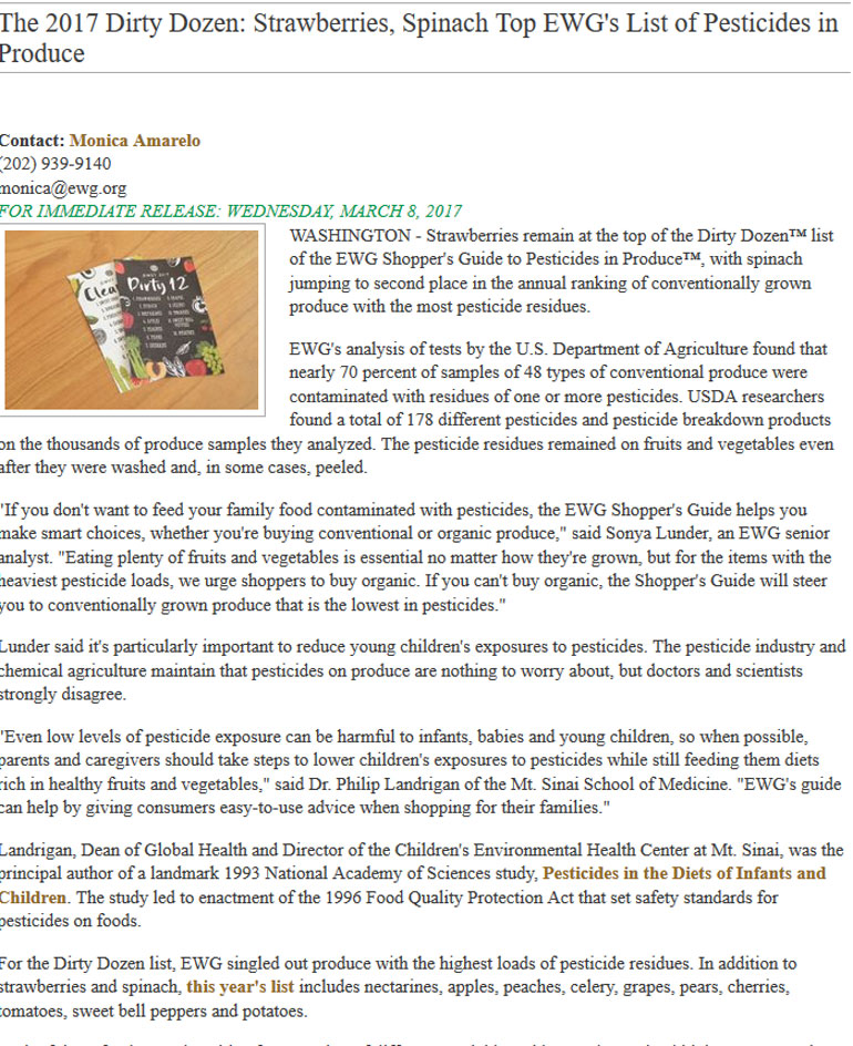 Όπως σημειώνεται, οι φράουλες περισσότερο από κάθε άλλο φρέσκο φρούτο είναι γεμάτες υπολείμματα φυτοφαρμάκων, ακόμα κι όταν καθαρίζονται και συσκευάζονται.