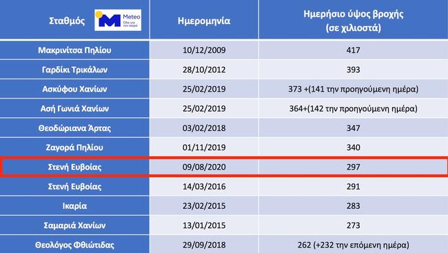Ναι ήταν ακραίο. Ο μετεωρολογικός σταθμός του Εθνικού Αστεροσκοπείου Αθηνών/meteo.gr στη Στενή Ευβοίας κατέγραφε 297 χιλιοστά βροχής μέσα σε 8 ώρες. Παρόμοια ύψη βροχής σε διαστήματα μικρότερα της μιας ημέρας στο παρελθόν δίνονται ενδεικτικά στον πίνακα που ακολουθεί: