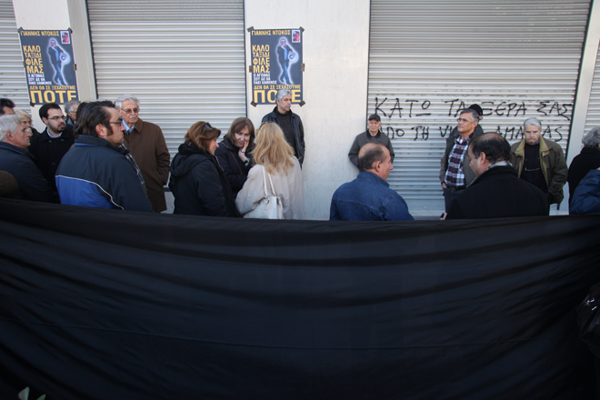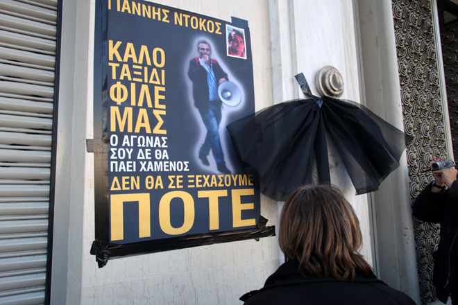 Μικροομολογιούχοι με αφίσες που έγραφαν «Καλό ταξίδι φίλε μας, ο αγώνας σου δεν θα πάει χαμένος, δεν θα σε ξεχάσουμε ποτέ», είπαν το δικό τους αντίο στον 49χρονο, Γιάννη Ντόκο.