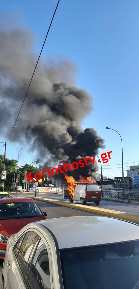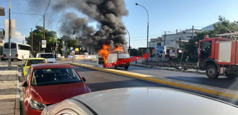 Στις φλόγες τυλίχθηκε το πρωί της Παρασκευής Ι.Χ. φορτηγάκι, ενώ βρισκόταν εν κινήσει στα φανάρια του Κιάτου, στην παλαιά εθνική oδό Κορίνθου – Πατρών.