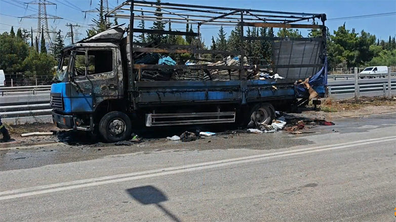 Μέσα σε δευτερόλεπτα όμως ξεπετάχτηκαν φλόγες που τύλιξαν και εν τέλει κατέκαψαν το όχημα, το οποίο μετέφερε πλαστικές σακούλες.