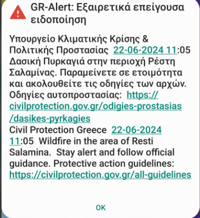 Επίσης, ενεργοποιήθηκε το 112, το οποίο έστειλε μήνυμα στους κατοίκους για αυξημένη ετοιμότητα.