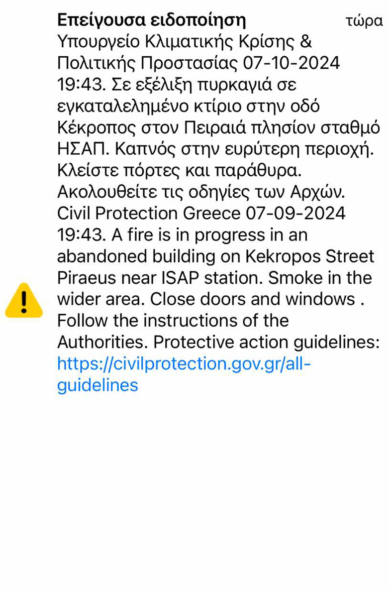 Στις 19:43, ήχησε το 112, ζητώντας από τους πολίτες να κλείσουν τις πόρτες και τα παράθυρα λόγω του καπνού.