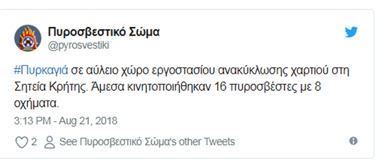 Φωτιά έχει ξεσπάσει το μεσημέρι της Τρίτης σε εργοστάσιο με ανακυκλώσιμα υλικά που βρίσκεται στον περιφερειακό της Σητείας.