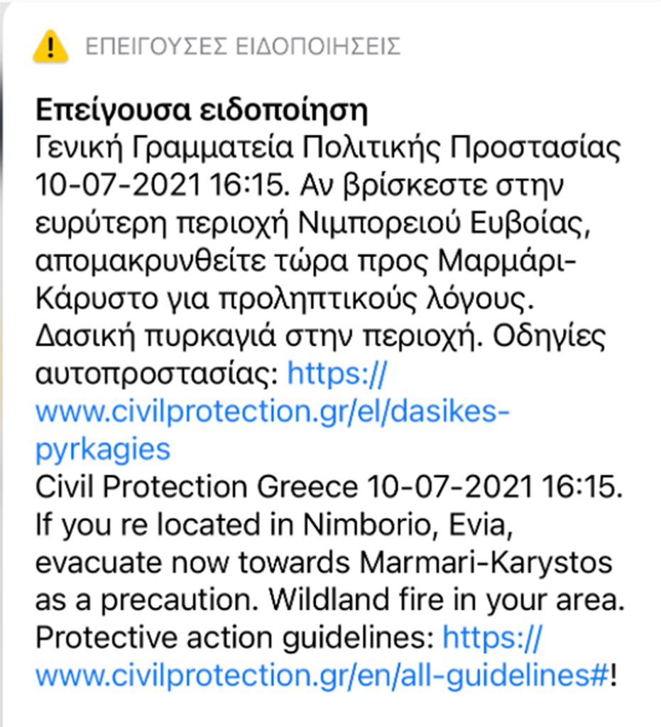 «Αν βρίσκεστε στην ευρύτερη περιοχή Νημποριού Εύβοιας απομακρυνθείτε τώρα προς Μαρμάρι – Κάρυστο για προληπτικούς λόγους. Δασική πυρκαγιά στην περιοχή», έλεγε το μήνυμα.