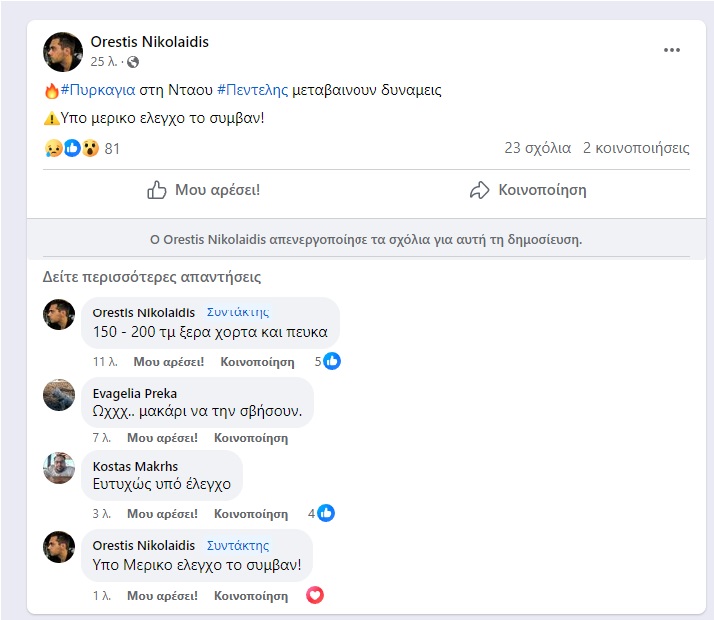 Το ξέσπασμα φωτιάς στην Πεντέλη αποτυπώνουν  στα μέσα κοινωνικής δικτύωσης κάτοικοι της περιοχής, οι οποίοι και επιβεβαιώνουν ότι οι δυνάμεις της Πυροσβεστικής την έχουν ήδη θέσει υπό μερικό έλεγχο.
