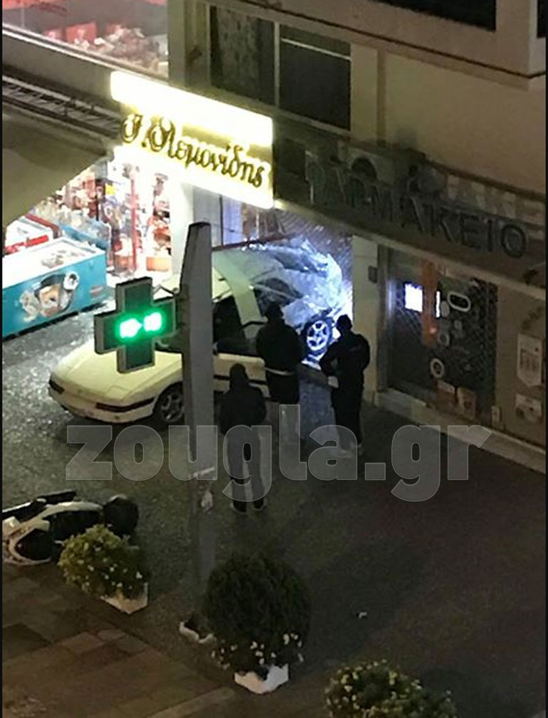 Στη φωτογραφία φαίνεται η κατάσταση του καταστήματος αμέσως μετά την αποχώρηση των ληστών. Όπως θα δείτε, το αυτοκίνητο που χρησιμοποίησαν είναι σφηνωμένο στο κατάστημα, με κάποιους κατοίκους της περιοχής να παρακολουθούν αποσβολωμένοι.