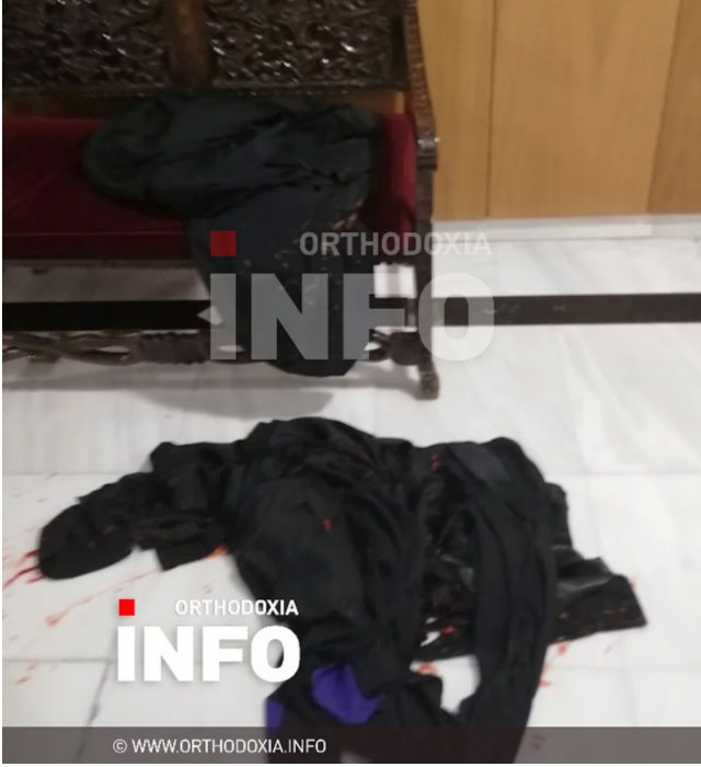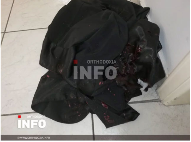 Οι πρώτες εικόνες έξω από την αίθουσα του Συνοδικού Δικαστηρίου δείχνουν το μέγεθος της επίθεσης, με τα άμφια των ιερωμένων να έχουν λιώσει από τη δολοφονική αυτή κίνηση του 37χρονου ιερέα.
