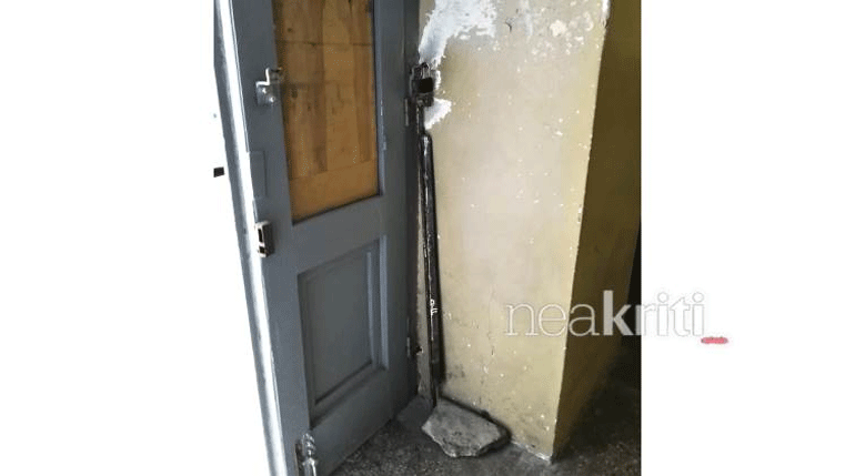Οι τοίχοι έχουν ρημάξει και στους δύο ορόφους του Δικαστικού Μεγάρου. Απαράδεκτο είναι το θέαμα που αντικρίζει κανείς βλέποντας και την πόρτα της εισόδου που βρίσκεται στην πίσω πλευρά του κτηρίου (από την πλευρά της οδού Χατζημιχάλη Γιάνναρη).