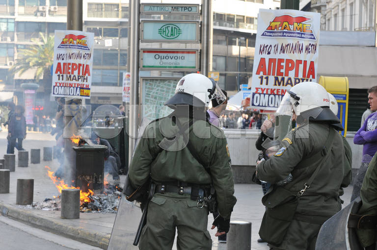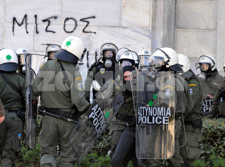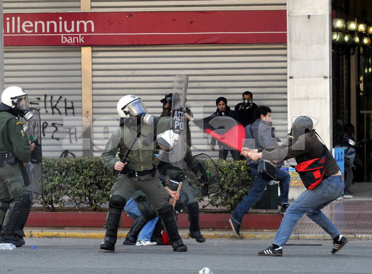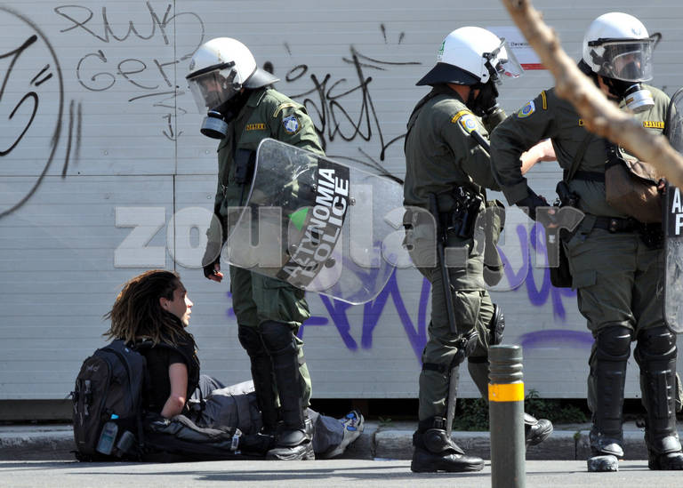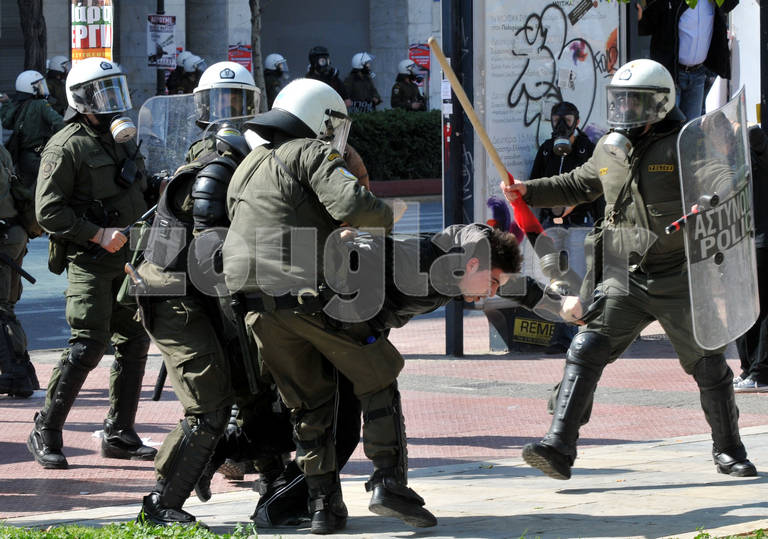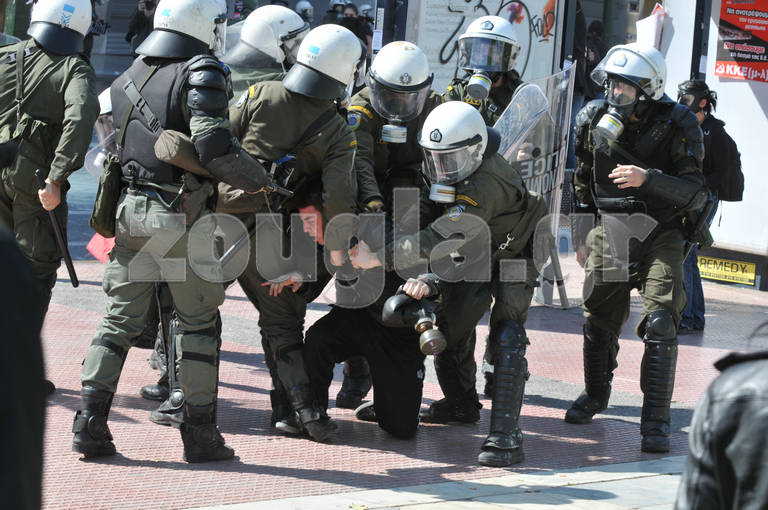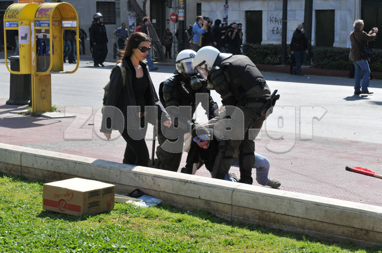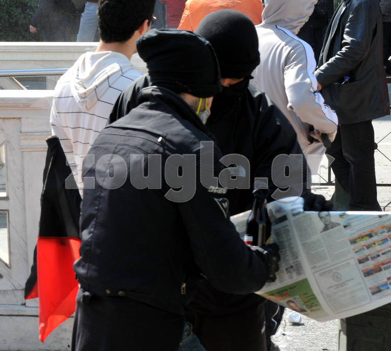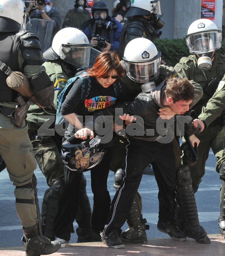Μπροστά στον φωτογραφικό φακό γίνονται βίαιες προσαγωγές διαδηλωτών. Από την άλλη πλευρά, νεαροί με κουκούλες ετοιμάζουν τα «πολεμοφόδιά» τους.