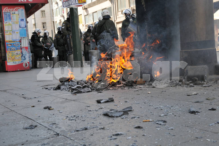 Μπροστά στον φωτογραφικό φακό γίνονται βίαιες προσαγωγές διαδηλωτών. Από την άλλη πλευρά, νεαροί με κουκούλες ετοιμάζουν τα «πολεμοφόδιά» τους.